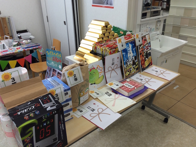 ビンゴ大会の景品です。1等ディズニーチケット、松阪牛、選べるギフト、魚沼産コシヒカリ10kgなど豪華景品が盛りだくさん。