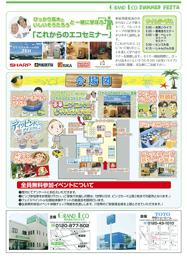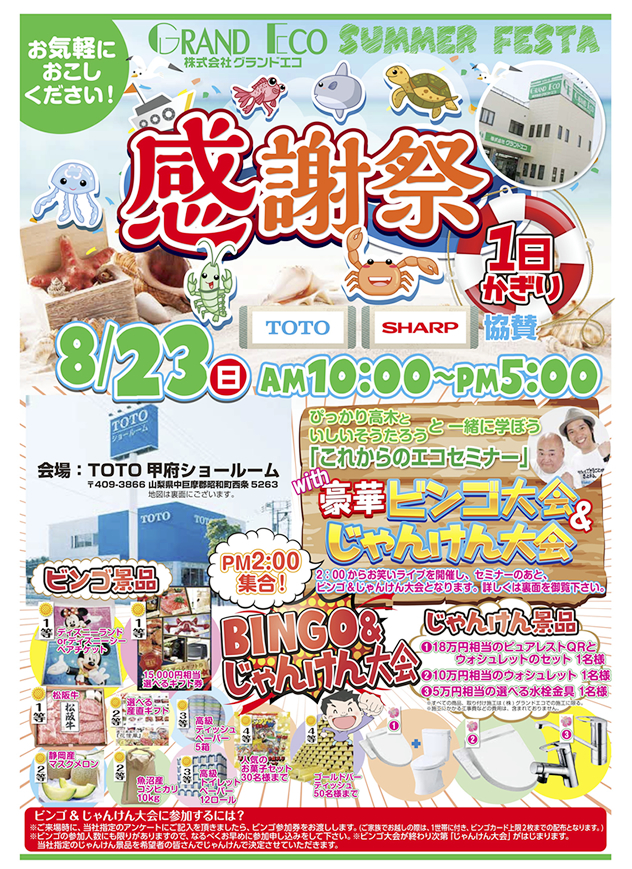 2015年8月23日TOTO甲府ショールームにおいて、株式会社グランドエコ大感謝祭をとり行いました。午前中から、多くのお客様にお越しいただき、また午後には、会場の駐車場が満車状態となり多くのお客様には多大なるご迷惑をかけてしまいまして大変申し訳ございませんでした。