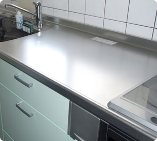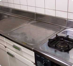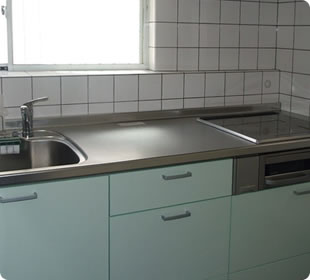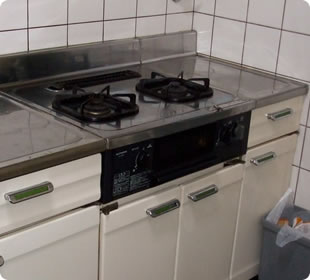 | 施工前:天板に継ぎ目のあるブロックキッチンです。2口ガスコンロをお使いでした。 | 施工後:色も変えて、モダンになりました。 |